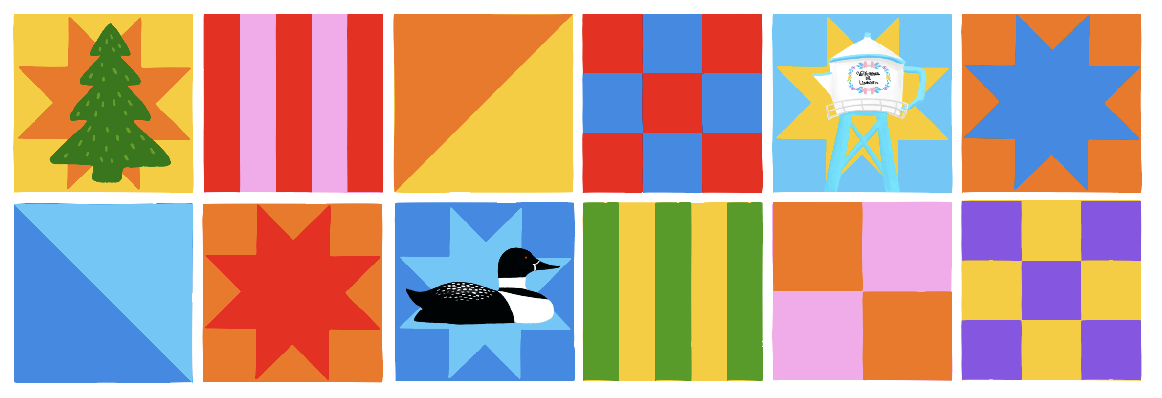 To bring the brand identity to life, I created more quilt patterns, color pairings, and illustrated local subjects. One of the illustrations includes Lindstrom’s iconic coffee pot water tower, a loon, and a tree illustration. These are drawn elements with a bit more texture layered on top of the quilt designs to give it a personable feel. This brings more personality to the branding on various collateral for the event such as posters, social media posts, banners, and more. It makes it more integrated into the local culture and while also creating an individual brand and identity.